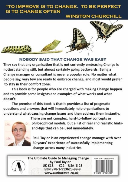 They say that any organisation that is not currently embracing Change is not just standing still, but going backwards. Being a Change manager or consultant is never a popular role. No matter what people say, very few are ready to embrace change, and most would prefer to stay in their comfort This book is for people who are charged with making Change happen and to provide some insights and examples of what works and what doesn't. The premise of this book is that it provides a list of pragmatic questions (with answers) that will immediately help organisations to understand what causing change issues and then address them instantly. There are no complex, hard-to-follow concepts or philosophical models, but a list of real and realistic hints and tips that can be used immediately. Paul Taylor is an experienced change manager with over 30 years of experience in successfully implementing change across many industries.