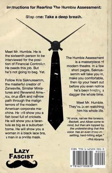 "At once, names like Ionesco, Beckett, and Albee come to mind, but then are topped by the understanding that this voice has an even more unsettling, hard-hitting edge." -Phil Abrams Instructions for Reading The Humble Assessment: Step one: Take a deep breath. Meet Mr. Humble. He is the sixteenth person to be interviewed for the position of Financial Controller. He needs this job. But he's not going to beg. Yet. Follow Kris Saknussemm, the masterful creator of Zanesville, Sinister Miniatures and Reverend America, on a dark and narrow path through the malign terrors of the modern American corporate machine. He will show you a fish bowl full of crickets. He will show you a tarantula as big as a suburban home. He will show you a woman in a black lace bra, a man in a gorilla mask. The Humble Assessment is a masterpiece of modern theatre. In a few short pages, Saknussemm will take you in, make you comfortable, then rip your heart out before you even notice he's been holding a dagger the whole time. Meet Mr. Humble. They've been watching him his whole life.