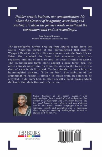 The Hummingbird Project: Creating from Scratch comes from the Native American legend of the hummingbird that inspired Wangari Maathai, the first African woman to win the Nobel Peace Prize. She launched the Green Belt movement which has replanted millions of trees to stop the desertification of Kenya. The Hummingbird fights alone against a huge forest fire, the other animals watch him fly from the river to the forest with a drop of water in his little beak. To the animals that mock him, the hummingbird answers... "I do my best". The ambition of the Hummingbird Project is similar: to create from an object to be recycled, to do one's best, to offer oneself a break during which the hands find their first role of creation.