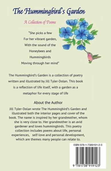 "She picks a few For her vibrant garden, With the sound of the Honeybees and Hummingbirds Moving through her mind." Jill Tyler-Dolan wrote The Hummingbird's Garden and illustrated both the interior pages and cover of the book. The name is inspired by her grandmother, whom she is very close to. Her grandmother is an avid gardener and loves hummingbirds. This poetry collection includes poems about life, personal experiences, self-love and personal development, which are themes many people can relate to. The Hummingbird's Garden is a collection of poetry written and illustrated by Jill Tyler-Dolan. This book is a reflection of life itself, with a garden as a metaphor for every stage of life.