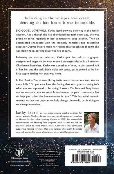What if you just trusted the whisper of calling placed on your heart? Kathy Izard was volunteering at Charlotte's Urban Ministry Center when an unlikely meeting with a homeless man changed the course of her life. She realized that serving at the soup kitchen was feeding her soul, but not actually solving the needs of the homeless population. Rather than brush it off and avoid what she now felt called to take on, she quit her job and took on what seemed like an insurmountable task--building housing for Charlotte's homeless. Woven together with this uplifting story of social action is Kathy's personal struggle with faith, forgiveness and fulfillment. In telling her story, Kathy invites you to consider rewriting your own. What's calling you? As crazy at it seems, it may be crazier not to try. This book will push you to do so much more than you ever thought possible.