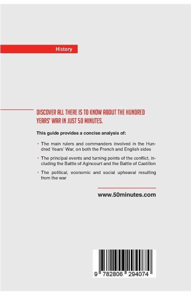 Keen to learn but short on time? Get to grips with the events of the Hundred Years¿ War in next to no time with this concise guide. 50Minutes.com provides a clear and engaging analysis of the Hundred Years¿ War. One of the longest direct conflicts between two countries, the Hundred Years¿ War marked the culmination of tensions between the French and English over territory and the claim to the throne in France. The war, which saw the appearance of new military tactics and led to the development of strong national identities in both countries, is widely considered to be one of the most important conflicts of the Middle Ages. In just 50 minutes you will: ¿ Learn about the main rulers and commanders involved in the Hundred Years¿ War, on both the French and English sides ¿ Understand the principal events and turning points of the conflict, including the Battle of Agincourt and the Battle of Castillon ¿ Find out about the political, economic and social upheaval resulting from the war ABOUT 50MINUTES.COM History & Culture 50MINUTES.COM will enable you to quickly understand the main events, people, conflicts and discoveries from world history that have shaped the world we live in today. Our publications present the key information on a wide variety of topics in a quick and accessible way that is guaranteed to save you time on your journey of discovery.