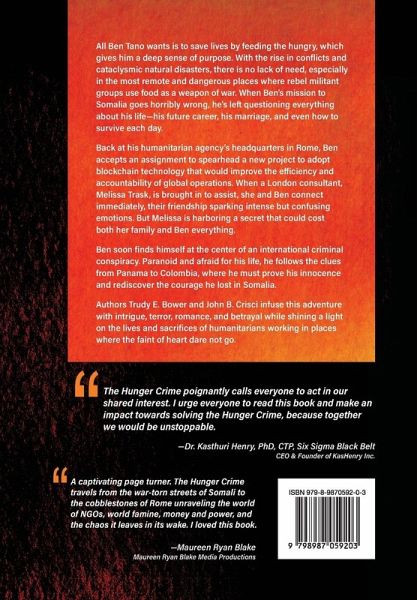 All Ben Tano wants is to save lives by feeding the hungry, which gives him a deep sense of purpose. With the rise in conflicts and cataclysmic natural disasters, there is no lack of need, especially in the most remote and dangerous places where rebel militant groups use food as a weapon of war. When Ben's mission to Somalia goes horribly wrong, he's left questioning everything about his life-his future career, his marriage, and even how to survive each day. Back at his humanitarian agency's headquarters in Rome, Ben accepts an assignment to spearhead a new project to adopt blockchain technology that would improve the efficiency and accountability of global operations. When a London consultant, Melissa Trask, is brought in to assist, she and Ben connect immediately, their friendship sparking intense but confusing emotions. But Melissa is harboring a secret that could cost both her family and Ben everything. Ben soon finds himself at the center of an international criminal conspiracy. Paranoid and afraid for his life, he follows the clues from Panama to Colombia, where he must prove his innocence and rediscover the courage he lost in Somalia. Authors Trudy E. Bower and John B. Crisci infuse this adventure with intrigue, terror, romance, and betrayal while shining a light on the lives and sacrifices of humanitarians working in places where the faint of heart dare not go.