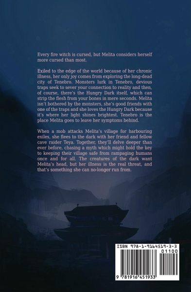 Every fire witch is cursed, but Melita considers herself more cursed than most. Exiled to the edge of the world, because of her chronic illness, her only joy comes from exploring the long-dead city of Tenebro. Monsters lurk in Tenebro, devious traps seek to sever your connection to reality and then, of course, there's the Hungry Dark itself, which can strip the flesh from your bones in mere seconds. Melita isn't bothered by the monsters, she's good friends with one of the traps and she loves the Hungry Dark because it's where her light shines brightest. Tenebro is the place Melita goes to leave her symptoms behind. When a mob attacks Melita's village for harbouring exiles, she flees to the dark with her friend and fellow cave raider Teya. Together, they'll delve deeper than ever before, chasing a myth which might hold the key to keeping their village safe from rampaging humans once and for all. The creatures of the dark want Melita's head, but her illness is the real threat, and that's something she can no-longer run from.