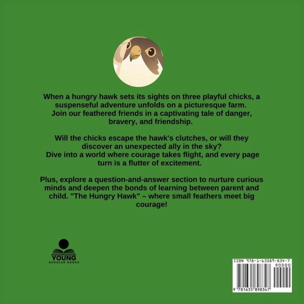 Dive into the enchanting world of The Hungry Hawk, a captivating counting tale thriller that takes young readers on an adventure filled with suspense, learning, and valuable life lessons. A famished hawk with keen eyesight is on the prowl, ready to swoop down and feast. But on a vibrant farm below, three brave little chicks play, oblivious to the danger that lurks above. As the hawk draws nearer, will the trio's playful frolics turn into a desperate dash for safety? Will they uncover the strength within and the help around them to escape the hawk's clutches? Each page turn heightens the suspense, weaving a magical dance of danger and bravery, instinct and ingenuity. Illustrated with enchanting artwork, each scene brings the farm and its lovable inhabitants to life, sparking imagination and curiosity in young minds. In this delightful narrative, children will explore themes of danger, courage, and friendship. For Parents and Guardians But the adventure doesn't end when the last page is turned. "The Hungry Hawk" extends its educational journey with a thought-provoking question-and-answer section designed for parents and guardians. Engage in meaningful conversations with your young ones, unraveling the hidden gems of learning tucked within the story, nurturing a generation of thoughtful, empathetic, and brave souls ready to face the world's adventures.