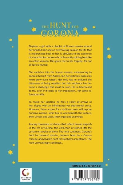 Daphne, a girl with a chaplet of flowers woven around her braided hair and an overflowing passion for life that is reciprocated back to her, is oblivious to the existence of a heartbroken wooer who is fervently spitting heat like an active volcano. This gives rise to her tragedy; for not all love is mutual. She vanishes into the human masses, endeavoring to conceal herself from Apollo, but her getaway makes his heart grow even fonder. Not only has he endured the bitterness of being repelled, but this insolence has become a challenge that must be won. He is determined to try, even if it leads to her eradication . . . for some infatuation kills. To reveal her location, he fires a volley of arrows at her, tipped with an infinitesimal yet detrimental curse. However, these arrows for a dubious cause will expose humans instead-what lies on and beneath the surface, their virtues and vices, their angst and yearnings. Among thousands of stories that reflect human anguish in the era of Corona, this collection of stories lifts the curtain on twelve of them. The hunt continues Corona's hunt for humans' demise, humans' hunt for a Corona remedy, and Apollo's hunt for Daphne's acceptance. The hunt unwaveringly continues. . .