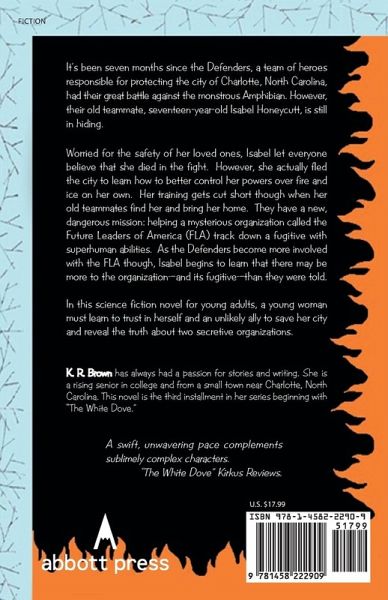 It's been seven months since the Defenders, a team of heroes responsible for protecting the city of Charlotte, North Carolina, had their great battle against the monstrous Amphibian. However, their old teammate, seventeen-year-old Isabel Honeycutt, is still in hiding. Worried for the safety of her loved ones, Isabel let everyone believe that she died in the fight. However, she actually fled the city to learn how to better control her powers over fire and ice on her own. Her training gets cut short though when her old teammates find her and bring her home. They have a new, dangerous mission: helping a mysterious organization called the Future Leaders of America (FLA) track down a fugitive with superhuman abilities. As the Defenders become more involved with the FLA though, Isabel begins to learn that there may be more to the organization-and its fugitive-than they were told. In this science fiction novel for young adults, a young woman must learn to trust in herself and an unlikely ally to save her city and reveal the truth about two secretive organizations.