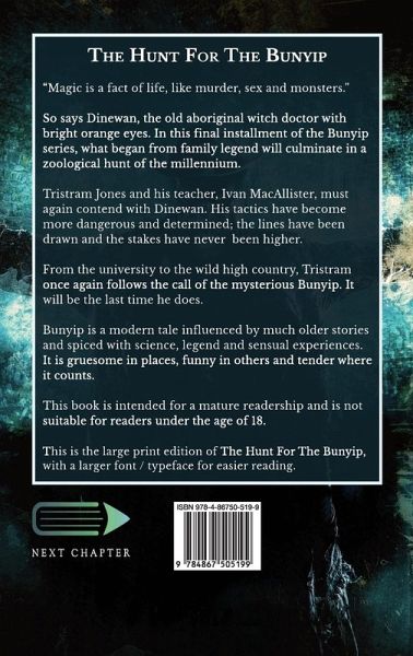 "Magic is a fact of life, like murder, sex and monsters." So says Dinewan, the old aboriginal witch doctor with bright orange eyes. In this final installment of the Bunyip series, what began from family legend will culminate in a zoological hunt of the millennium. Tristram Jones and his teacher, Ivan MacAllister, must again contend with Dinewan. His tactics have become more dangerous and determined; the lines have been drawn and the stakes have never been higher. From the university to the wild high country, Tristram once again follows the call of the mysterious Bunyip. It will be the last time he does. Bunyip is a modern tale influenced by much older stories and spiced with science, legend and sensual experiences. It is gruesome in places, funny in others and tender where it counts. This book is intended for a mature readership and is not suitable for readers under the age of 18. This is the large print edition of The Hunt For The Bunyip, with a larger font / typeface for easier reading.¿
