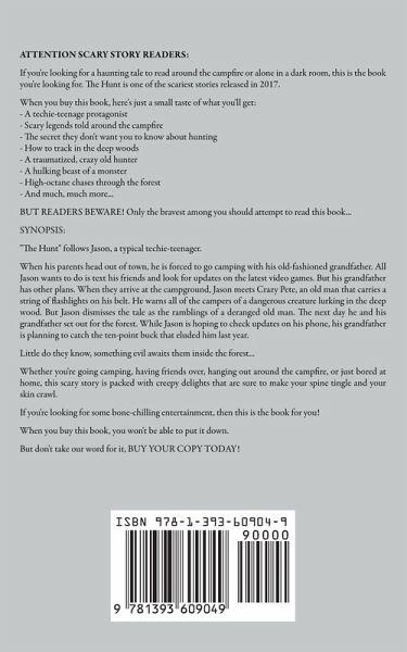 ATTENTION SCARY STORY READERS: If you're looking for a haunting tale to read around the campfire or alone in a dark room, this is the book you're looking for. The Hunt is one of the scariest stories released in 2017. When you buy this book, here's just a small taste of what you'll get: - A techie-teenage protagonist - Scary legends told around the campfire - The secret they don't want you to know about hunting - How to track in the deep woods - A traumatized, crazy old hunter - A hulking beast of a monster - High-octane chases through the forest - And much, much more... BUT READERS BEWARE! Only the bravest among you should attempt to read this book... SYNOPSIS: "The Hunt" follows Jason, a typical techie-teenager. When his parents head out of town, he is forced to go camping with his old-fashioned grandfather. All Jason wants to do is text his friends and look for updates on the latest video games. But his grandfather has other plans. When they arrive at the campground, Jason meets Crazy Pete, an old man that carries a string of flashlights on his belt. He warns all of the campers of a dangerous creature lurking in the deep wood. But Jason dismisses the tale as the ramblings of a deranged old man. The next day he and his grandfather set out for the forest. While Jason is hoping to check updates on his phone, his grandfather is planning to catch the ten-point buck that eluded him last year. Little do they know, something evil awaits them inside the forest... Whether you're going camping, having friends over, hanging out around the campfire, or just bored at home, this scary story is packed with creepy delights that are sure to make your spine tingle and your skin crawl. If you're looking for some bone-chilling entertainment, then this is the book for you! When you buy this book, you won't be able to put it down. But don't take our word for it, BUY YOUR COPY TODAY!