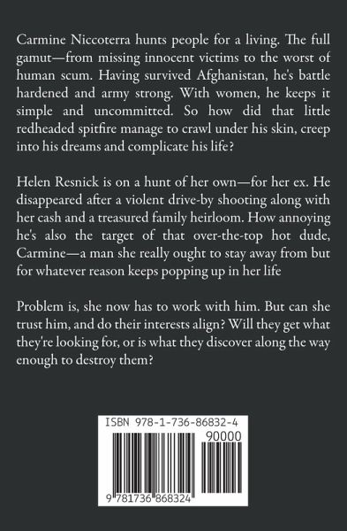 Carmine Niccoterra hunts people for a living. The full gamut-from missing innocent victims to the worst of human scum. Having survived Afghanistan, he's battle hardened and army strong. With women, he keeps it simple and uncommitted. So how did that little redheaded spitfire manage to crawl under his skin, creep into his dreams and complicate his life? Helen Resnick is on a hunt of her own-for her ex. He disappeared after a violent drive-by shooting along with her cash and a treasured family heirloom. How annoying he's also the target of that over-the-top hot dude, Carmine-a man she really ought to stay away from but for whatever reason keeps popping up in her life Problem is, she now has to work with him. But can she trust him, and do their interests align? Will they get what they're looking for, or is what they discover along the way enough to destroy them?
