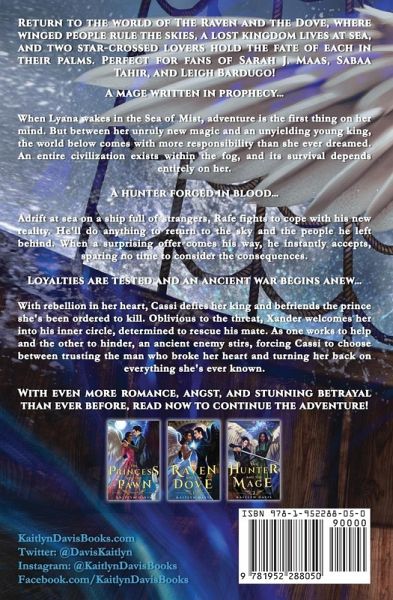 Return to the world of The Raven and the Dove, where winged people rule the skies, a lost kingdom lives at sea, and two star-crossed lovers hold the fate of each in their palms. Perfect for fans of Sarah J. Maas, Sabaa Tahir, and Leigh Bardugo! A mage written in prophecy... When Lyana wakes in the Sea of Mist, adventure is the first thing on her mind. But between her unruly new magic and an unyielding young king, the world below comes with more responsibility than she ever dreamed. An entire civilization exists within the fog, and its survival depends entirely on her. A hunter forged in blood... Adrift at sea on a ship full of strangers, Rafe fights to cope with his new reality. He'll do anything to return to the sky and the people he left behind. When a surprising offer comes his way, he instantly accepts, sparing no time to consider the consequences. Loyalties are tested and an ancient war begins anew... With rebellion in her heart, Cassi defies her king and befriends the prince she's been ordered to kill. Oblivious to the threat, Xander welcomes her into his inner circle, determined to rescue his mate. As one works to help and the other to hinder, an ancient enemy stirs, forcing Cassi to choose between trusting the man who broke her heart and turning her back on everything she's ever known. With even more romance, angst, and stunning betrayal than ever before, scroll up and click buy now to continue the adventure!