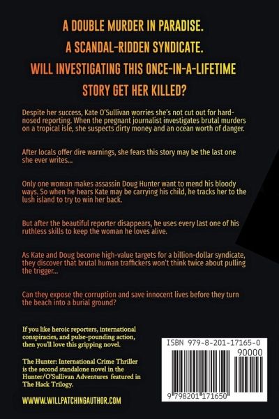 A double murder in paradise. A scandal-ridden syndicate. Will investigating this once-in-a-lifetime story get her killed? Despite her success, Kate O'Sullivan worries she's not cut out for hard-nosed reporting. When the pregnant journalist investigates brutal murders on a tropical isle, she suspects dirty money and an ocean worth of danger. After locals offer dire warnings, she fears this story may be the last one she ever writes… Only one woman makes assassin Doug Hunter want to mend his bloody ways. So when he hears Kate may be carrying his child, he tracks her to the lush island to try to win her back. But after the beautiful reporter disappears, he uses every last one of his ruthless skills to keep the woman he loves alive. As Kate and Doug become high-value targets for a billion-dollar syndicate, they discover that brutal human traffickers won't think twice about pulling the trigger… Can they expose the corruption and save innocent lives before they turn the beach into a burial ground? The Hunter: International Crime Thriller is the second standalone novel in the riveting Hack Trilogy. If you like heroic reporters, international conspiracies, and pulse-pounding action, then you'll love Will Patching's gripping novel. Order The Hunter today to expose the dark side of paradise!
