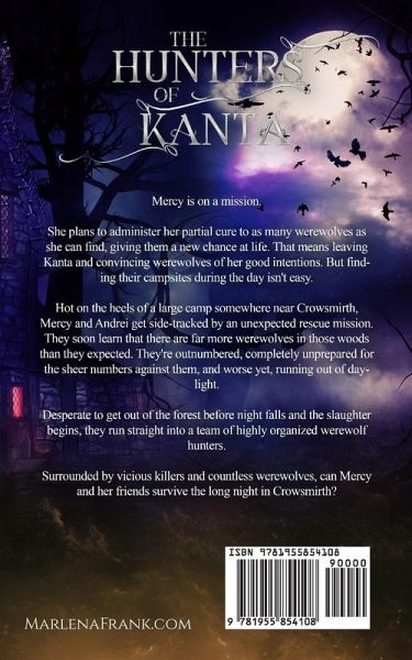 Mercy is on a mission. She plans to administer her partial cure to as many werewolves as she can find, giving them a new chance at life. That means leaving Kanta and convincing werewolves of her good intentions. But finding their campsites during the day isn't easy. Hot on the heels of a large camp somewhere near Crowsmirth, Mercy and Andrei get side-tracked by an unexpected rescue mission. They soon learn that there are far more werewolves in those woods than they expected. They're outnumbered, completely unprepared for the sheer numbers against them, and worse yet, running out of daylight. Desperate to get out of the forest before night falls and the slaughter begins, they run straight into a team of highly organized werewolf hunters. Surrounded by vicious killers and countless werewolves, can Mercy and her friends survive the long night in Crowsmirth? The Hunters of Kanta is Book 3 in The Wolves of Kanta series.