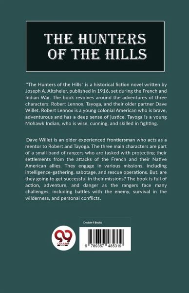 "The Hunters of the Hills" is a historical fiction novel written by Joseph A. Altsheler, published in 1916, set during the French and Indian War. The book revolves around the adventures of three characters: Robert Lennox, Tayoga, and their older partner Dave Willet. Robert Lennox is a young colonial American who is brave, adventurous and has a deep sense of justice. Tayoga is a young Mohawk Indian, who is wise, cunning, and skilled in fighting. Dave Willet is an older experienced frontiersman who acts as a mentor to Robert and Tayoga. The three main characters are part of a small band of rangers who are tasked with protecting their settlements from the attacks of the French and their Native American allies. They engage in various missions, including intelligence-gathering, sabotage, and rescue operations. But, are they going to get successful in their missions? The book is full of action, adventure, and danger as the rangers face many challenges, including battles with the enemy, survival in the wilderness, and personal conflicts.