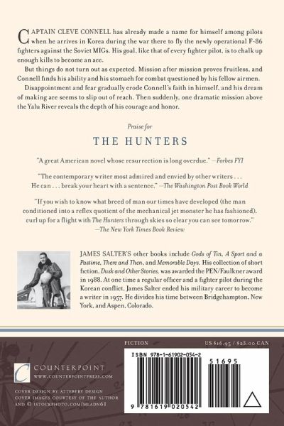 Captain Cleve Connell has already made a name for himself among pilots when he arrives in Korea during the war there to fly the newly operational F–86 fighters against the Soviet MIGs. His goal, like that of every fighter pilot, is to chalk up enough kills to become an ace. But things do not turn out as expected. Mission after mission proves fruitless, and Connell finds his ability and his stomach for combat questioned by his fellow airmen: the brash wing commander, Imil; Captain Robey, an ace whose record is suspect; and finally, Lieutenant Pell, a cocky young pilot with an uncanny amount of skill and luck. Disappointment and fear gradually erode Connell's faith in himself, and his dream of making ace seems to slip out of reach. Then suddenly, one dramatic mission above the Yalu River reveals the depth of his courage and honor. Originally published in 1956, The Hunters was James Salter's first novel. Based on his own experiences as a fighter pilot in the Korean War, it is a classic of wartime fiction. Now revised by the author and back in print on the sixty–fifth anniversary of the Air Force, the story of Cleve Connell's war flies straight into the heart of men's rivalries and fears.