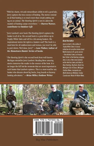 Full color, awesome photos. "The Hunting Spirit" is a terrific follow up to Jerry Lambert's bestselling hunting book, "Trophy White Tales." This book utilizes the same short story format but in addition to riveting deer hunting tales there are also stories about Africa, bear, elk and turkey hunting. Hunting has a unique aura filled with traditions and mystique. Jerry captures the hunting spirit through both fiction (tall tales) as well as real life adventures (campfire stories). Both genres are spiced with "laugh out loud" humor as well as stories that will stir up heartwarming emotions. Jerry writes in a manner that makes you feel like you are right there, on the adventure and are the one participating in the hunt. A great fireside read that can be enjoyed by people of all ages!Full color, awesome photos.