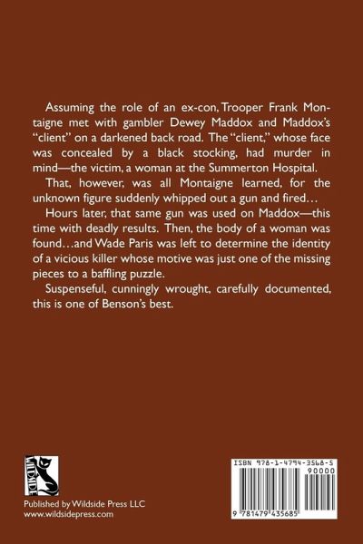 Assuming the role of an ex-con, Trooper Frank Montaigne met with gambler Dewey Maddox and Maddox's "client" on a darkened back road. The "client," whose face was concealed by a black stocking, had murder in mind -- the victim, a woman at the Summerton Hospital. That, however, was all Montaigne learned, for the unknown figure suddenly whipped out a gun and fired... Hours later, that same gun was used on Maddox -- this time with deadly results. Then, the body of a woman was found…and Wade Paris was left to determine the identity of a vicious killer whose motive was just one of the missing pieces to a baffling puzzle. Suspenseful, cunningly wrought, carefully documented, this is one of Benson's best.