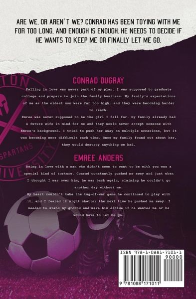 Are we, or aren't we? Conrad has been toying with me for too long, and enough is enough. He needs to decide if he wants to keep me or finally let me go. Conrad Dugray Falling in love was never part of my plan. I was supposed to graduate college and prepare to join the family business. My family's expectations of me as the oldest son were far too high, and they were becoming harder to reach. Emree was never supposed to be the girl I fell for. My family already had a future wife in mind for me and they would never accept someone with Emree's background. I tried to push her away on multiple occasions, but it was becoming more difficult each time. Once my family found out about her, they would destroy anything we had. Emree Anders Being in love with a man who didn't seem to want to be with you was a special kind of torture. Conrad constantly pushed me away and just when I thought I was over him, he was back again, claiming he couldn't go another day without me. My heart couldn't take the tug-of-war game he continued to play with it, and I feared it might shatter the next time he pushed me away. I needed to stand my ground and make him decide if he wanted me or he would have to let me go.