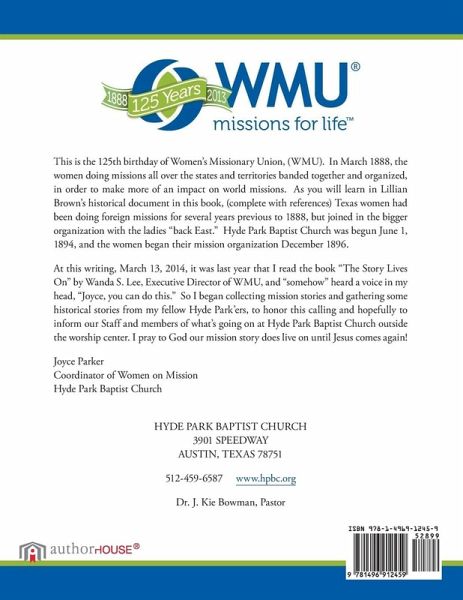 This is the 125th birthday of Women's Missionary Union, (WMU). In March 1888, the women doing missions all over the states and territories banded together and organized, in order to make more of an impact on world missions. As you will learn in Lillian Brown's historical document in this book, (complete with references) Texas women had been doing foreign missions for several years previous to 1888, but joined in the bigger organization with the ladies "back East." Hyde Park Baptist Church was begun June 1, 1894, and the women began their mission organization December 1896. At this writing, March 13, 2014, it was last year that I read the book "The Story Lives On" by Wanda S. Lee, Executive Director of WMU, and "somehow" heard a voice in my head, "Joyce, you can do this." So I began collecting mission stories and gathering some historical stories from my fellow Hyde Park'ers, to honor this calling and hopefully to inform our Staff and members of what's going on at Hyde Park Baptist Church outside the worship center. I pray to God our mission story does live on until Jesus comes again! Joyce Parker Coordinator of Women on Mission Hyde Park Baptist Church