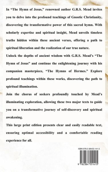 In "The Hymn of Jesus," renowned author G.R.S. Mead invites you to delve into the profound teachings of Gnostic Christianity, discovering the transformative power of this sacred hymn. With scholarly expertise and spiritual insight, Mead unveils timeless truths hidden within these ancient verses, offering a path to spiritual liberation and the realization of our true nature.Unlock the depths of ancient wisdom with G.R.S. Mead's "The Hymn of Jesus" and continue the enlightening journey with his companion masterpiece, "The Hymns of Hermes." Explore profound teachings within these works, discovering the path to spiritual illumination.Join the chorus of seekers profoundly touched by Mead's illuminating exploration, allowing these two major texts to guide you on a transformative journey of self-discovery and spiritual awakening.This large print edition presents clear and easily readable text, ensuring optimal accessibility and a comfortable reading experience for all.