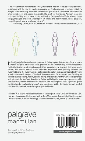 In The Hyper(in)visible Fat Woman Gailey investigates the interface between fat women's perceptions of their bodies and of the social expectations and judgments placed on them. The book explores the phenomenon of 'hyper(in)visibility', the seemingly paradoxical social position of being paid exceptional attention while simultaneously being erased.