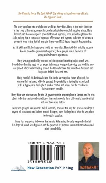 The hypnotic touch, the dark side of life follows on from book one which is The hypnotic touch. The story develops into a whole new world for Harry Hart. Harry is the main character in this story of hypnosis, suggestion, and manipulative control of people's minds. Harry learned and then developed a powerful form of hypnosis, once he had heightened his skills making him a competent exponent of hypnosis and hypnotic induction he became a powerful force in the field of hypnotic therapy and NLP, Neuro linguistic Programming. As his skills and his business grew so did his reputation. He quickly but invisibly became known to certain government agencies; these people live in the world of spying and subversive operations. Harry was approached by them to help in a ground-breaking project which was heavily based on the need for an expert in hypnosis to support, develop and lead the way in a project which will ultimately protect the UK and indeed the world from terrorism and the people behind these evil acts. Harry Hart left his business behind him in the very capable hands of one of the women that he loved, while he pursued the possibility of taking his exceptional skills in hypnosis to the highest level of control and power that he could never have dreamed possible. Harry Hart was now working for the UK government in a secret place in London and he was about to be the creator and expeditor of the most powerful form of hypnotic induction that had ever been used before. Harry was going to use hypnosis to kill terrorists, however the way this process develops is beyond all reasonable and indeed natural thoughts, even the legality of what he was about to do was in question. Harry Hart was going to become the terrorist killer using the only weapon he had at his disposal, which was hypnosis and the power of his superior subliminal instructions and mind control skills.
