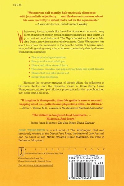 When every hiccup sounds like the call of doom, each stomach pang hints at incipient cancer, and a headache means it's time to firm up your last will and testament, The Hypochondriac's Guide to Life. And Death. provides just the relief you need. Gene Weingarten has spent his whole life immersed in the eclectic details of bizarre symptoms, self-diagnosing every minor ache as a potentially deadly disease. Weingarten examines: * The mind of a hypochondriac * How your doctor can kill you * Ulcers and other visceral fears * The snaps, crackles, and pops of your body that spell disaster * Things that can take an eye out * Interpreting DocSpeak Blending the neurotic anxieties of Woody Allen, the folksiness of Garrison Keillor, and the absurdist vision of Dave Barry, Gene Weingarten conjures up a hilarious prescription for the hypochondriac that lurks inside all of us.