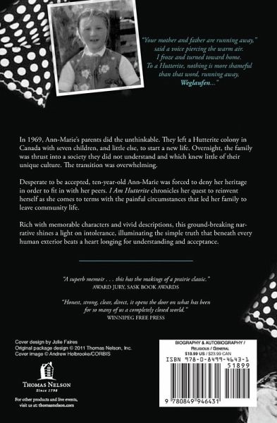 In 1969, Ann-Marie's parents did the unthinkable, leaving a Hutterite colony with their seven children to start a new life. Overnight, the family was thrust into a society they did not understand and did not understand them in this powerful story of understanding how our beginnings often define us. "Your mother and father are running away," said a voice piercing the warm air. I froze and turned toward home. To a Hutterite, nothing is more shameful than that word." When Ann-Marie's parents decided to leave their Hutterite colony in Canada with their seven children in tow, it was a complete shock. Overnight, the family was thrust into a society they did not understand, and which knew little of their unique culture. The transition was overwhelming. Desperate to be accepted, ten-year-old Ann-Marie was forced to deny her heritage in order to fit in with her peers. I Am Hutterite chronicles Ann-Marie's quest to reinvent herself as she comes to terms with the painful circumstances that led her family to leave community life. Before she left the colony, Ann-Marie had never tasted macaroni and cheese or ridden a bike. She had never heard of Walt Disney or rock-and-roll. With great humor, she describes how she adapted to popular culture, and with raw honesty, her family's deep sense of loss for their community. * Winner of the 2007 Saskatchewan Book Award for Non-fiction * Unveils the rich history and traditions of the Hutterite people's extraordinary way of life * Includes a glossary of Hutterite words and phrases, family photos, and a family tree In this insightful memoir, venture into the hidden heart of the little-known Hutterite colony. Rich with memorable characters and vivid descriptions, this ground-breaking narrative shines a light on intolerance, illuminating the simple truth that beneath every human exterior beats a heart longing for understanding and acceptance.
