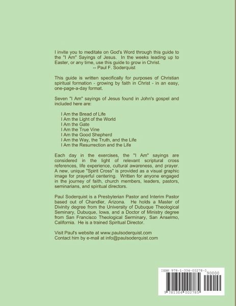 This is an inspiring devotional guide for the Christian season of Lent, or anytime, centered around the "I Am" sayings of Jesus found in the Gospel of John. Easy, one-page-a-day format for a 50 day season of spiritual growth. Written by a Christian, Presbyterian Pastor for anyone on the journey of faith, church members, leaders, Pastors, seminarians, or spiritual directors. Takes the reader through a daily Christian spiritual formation process: Prayer of the Week drawn from the classic treasury of prayers of the church, a Bible Reference and Text from the New Revised Standard Version NRSV, Comments for Consideration, Questions for Reflection, a Summarizing Point, and a Prayer of the Day. Original graphic "Spirit Cross" provides a visual point of prayerful centering. Provides a context for the reader to grow closer to Jesus Christ, the Great "I Am." Suitable for individual, small group, or large group use.