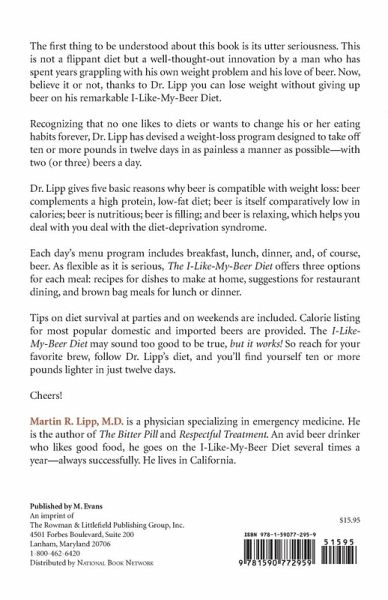 The first thing to be understood about this book is its utter seriousness. This is not a flippant diet but a well-thought-out innovation by a man who has spent years grappling with his own weight problem and his love of beer. Now, believe it or not, thanks to Dr. Lipp you can lose weight without giving up beer on his remarkable I-Like-My-Beer Diet. Recognizing that no one likes to diets or wants to change his or her eating habits forever, Dr. Lipp has devised a weight-loss program designed to take off ten or more pounds in twelve days in as painless a manner as possible—with two (or three) beers a day. Dr. Lipp gives five basic reasons why beer is compatible with weight loss: beer complements a high protein, low-fat diet; beer is itself comparatively low in calories; beer is nutritious; beer is filling; and beer is relaxing, which helps you deal with you deal with the diet-deprivation syndrome. Each day’s menu program includes breakfast, lunch, dinner, and, of course, beer. As flexible as it is serious, The I-Like-My-Beer Diet offers three options for each meal: recipes for dishes to make at home, suggestions for restaurant dining, and brown bag meals for lunch or dinner. Tips on diet survival at parties and on weekends are included. Calorie listing for most popular domestic and imported beers are provided. The I-Like-My-Beer Diet may sound too good to be true, but it works! So reach for your favorite brew, follow Dr. Lipp’s diet, and you’ll find yourself ten or more pounds lighter in just twelve days. Cheers!