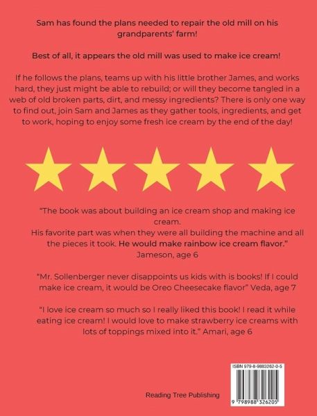 From siblings and educators, Ashely Sollenberger and Amber Kane comes a colorful, imaginative picture book that reminds kids to work together, go on adventures, and problem-solve. Perfect for kids of any age. Sam has found the plans needed to repair the old mill on his grandparents' farm! Best of all, it appears the old mill was used to make ice cream! If he follows the plans, teams up with his little brother James, and works hard they just might be able to rebuild; or will they become tangled in a web of old broken parts, dirt, and messy ingredients? There is only one way to find out, join Sam and James as they gather tools and ingredients, and get to work, hoping to enjoy some fresh ice cream by the end of the day! As a young child, Ashley has many vivid memories of exploring and playing inside his grandparents' old unused barn. These memories combined with his fascination with the many abandoned grist mills in his hometown provided the setting for this story. Like adding ingredients for ice cream, Ashley then took his experience working in a local ice cream shop, mixed it with his childhood memories, and incorporated phrases and character traits from his own two boys to develop the story. 54 colorful pages