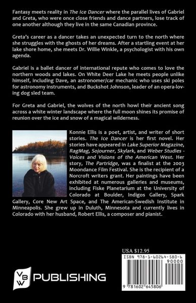 Fantasy meets reality in "The Ice Dancer" where the parallel lives of Gabriel and Greta, who were once close friends and dance partners, lose track of one another although they live in the same Canadian province. Greta's career as a dancer takes an unexpected turn to the north where she struggles with the ghosts of her dreams. After a startling event at her lake shore home, she meets Dr. Willie Winkle, a psychologist with his own agenda. Gabriel is a ballet dancer of international repute who comes to love the northern woods and lakes. On White Deer Lake he meets people unlike himself, including Dave, an astronomer/car mechanic who uses ski poles for astronomy instruments, and Buckshot Johnson, leader of an opera-loving dog sled team. For Greta and Gabriel, the wolves of the north howl their ancient song across a white winter landscape where the full moon shines its promise of reunion over the ice and snow of a magical wilderness.