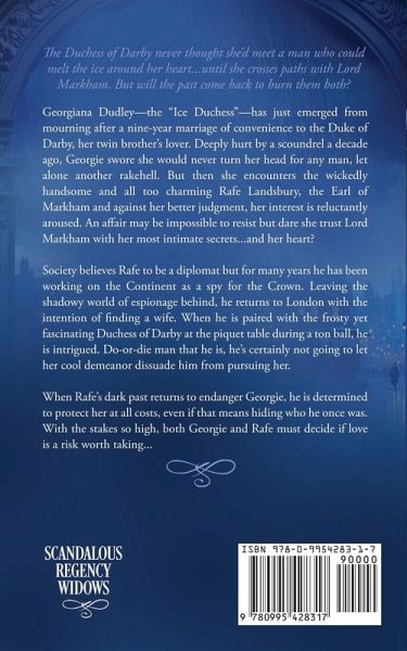 The Duchess of Darby never thought she'd meet a man who could melt the ice around her heart...until she crosses paths with Lord Markham. But will the past come back to burn them both? Georgiana Dudley-the "Ice Duchess"-has just emerged from mourning after a nine-year marriage of convenience to the Duke of Darby, her twin brother's lover. Deeply hurt by a scoundrel a decade ago, Georgie swore she would never turn her head for any man, let alone another rakehell. But then she encounters the wickedly handsome and all too charming Rafe Landsbury, the Earl of Markham and against her better judgment, her interest is reluctantly aroused. An affair may be impossible to resist but dare she trust Lord Markham with her most intimate secrets...and her heart? Society believes Rafe to be a diplomat but for many years he has been working on the Continent as a spy for the Crown. Leaving the shadowy world of espionage behind, he returns to London with the intention of finding a wife. When he is paired with the frosty yet fascinating Duchess of Darby at the piquet table during a ton ball, he is intrigued. Do-or-die man that he is, he's certainly not going to let her cool demeanor dissuade him from pursuing her. When Rafe's dark past returns to endanger Georgie, he is determined to protect her at all costs, even if that means hiding who he once was. With the stakes so high, both Georgie and Rafe must decide if love is a risk worth taking...