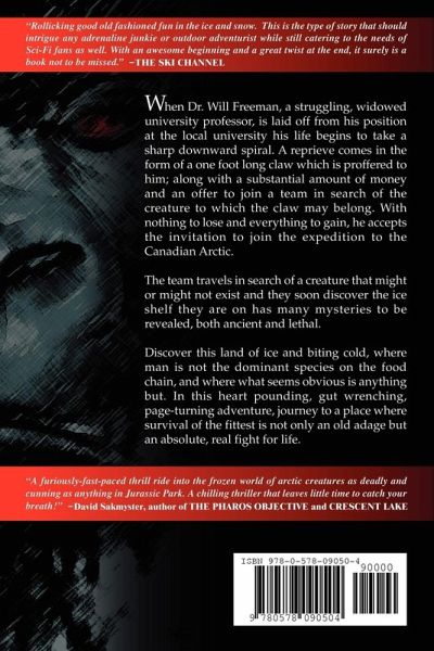 When Dr. Will Freeman, a struggling, widowed university professor, is laid off from his position at the local university his life begins to take a sharp downward spiral. A reprieve comes in the form of a one foot long claw which is proffered to him; along with a substantial amount of money and an offer to join a team in search of the creature to which the claw may belong. With nothing to lose and everything to gain, he accepts the invitation to join the expedition to the Canadian Arctic. The team travels in search of a creature that might or might not exist and they soon discover the ice shelf they are on has many mysteries to be revealed, both ancient and lethal. Discover this land of ice and biting cold, where man is not the dominant species on the food chain, and where what seems obvious is anything but. In this heart pounding, gut wrenching, page-turning adventure, journey to a place where survival of the fittest is not only an old adage but an absolute, real fight for life.