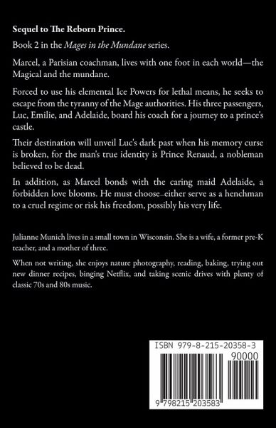 Sequel to The Reborn Prince. Book 2 in the Mages in the Mundane series. Marcel, a Parisian coachman, lives with one foot in each world-the Magical and the mundane. Forced to use his elemental Ice Powers for lethal means, he seeks to escape from the tyranny of the Mage authorities. His three passengers, Luc, Emilie, and Adelaide, board his coach for a journey to a prince's castle. The destination will surely unveil Luc's dark past when his memory curse is broken. As Marcel bonds with kindhearted, sweet Adelaide, a spark of forbidden love blooms. He must choose; either serve as a henchman to a cruel regime, or risk his freedom and possibly his very life. The second installment in a trilogy filled with 18th-century charm, magic, family drama, and sweet love stories.