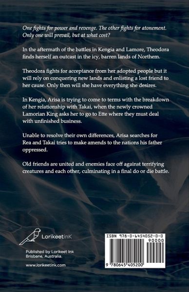 One fights for power and revenge. The other fights for atonement. Only one will prevail, but at what cost? In the aftermath of the battles in Kengia and Lamore, Theodora finds herself an outcast in the icy, barren lands of Northem. Theodora fights for acceptance from her adopted people but it will rely on conquering new lands and enlisting a lost friend to her cause. Only then will she have the power and revenge she desires. In Kengia, Arisa is trying to come to terms with the breakdown of her relationship with Takai, when the newly crowned Lamorian King asks her to go to Ette where they must deal with unfinished business. Unable to resolve their own differences, Arisa searches for Rea and Takai tries to make amends to the nations his father oppressed. Old friends are united and enemies face off against terrifying creatures and each other, culminating in a final do or die battle in Ivane. But this time around, victory will depend on much more than magic. It will be determined by loyalty, love, honour and letting go of everything you thought you wanted.