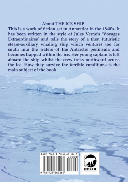 About THE ICE SHIP This is a work of fiction set in Antarctica in the 1840’s. It has been written in the style of Jules Verne’s ‘Voyages Extraordinaires’ and tells the story of a then futuristic steam-auxiliary whaling ship which ventures too far south into the waters of the Antarctica peninsula and becomes trapped within the ice. Her young captain is left aboard the ship whilst the crew treks northward across the ice. How they survive the terrible conditions is the main subject of the book. There are authentic photos, so real that you feel the cold. It is a story of courage and resourcefulness which questions the validity of overfishing and whaling in general.