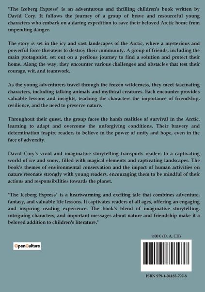 "The Iceberg Express" is an adventurous and thrilling children's book written by David Cory. It follows the journey of a group of brave and resourceful young characters who embark on a daring expedition to save their beloved Arctic home from impending danger. The story is set in the icy and vast landscapes of the Arctic, where a mysterious and powerful force threatens to destroy their community. A group of friends, including the main protagonist, set out on a perilous journey to find a solution and protect their home. Along the way, they encounter various challenges and obstacles that test their courage, wit, and teamwork. As the young adventurers travel through the frozen wilderness, they meet fascinating characters, including talking animals and mythical creatures. Each encounter provides valuable lessons and insights, teaching the characters the importance of friendship, resilience, and the need to preserve nature. Throughout their quest, the group faces the harsh realities of survival in the Arctic, learning to adapt and overcome the unforgiving conditions. Their bravery and determination inspire readers to believe in the power of unity and hope, even in the face of adversity. David Cory's vivid and imaginative storytelling transports readers to a captivating world of ice and snow, filled with magical elements and captivating landscapes. The book's themes of environmental conservation and the impact of human activities on nature resonate strongly with young readers, encouraging them to be mindful of their actions and responsibilities towards the planet. "The Iceberg Express" is a heartwarming and exciting tale that combines adventure, fantasy, and valuable life lessons. It captivates readers of all ages, offering an engaging and inspiring reading experience. The book's blend of imaginative storytelling, intriguing characters, and important messages about nature and friendship make it a beloved addition to children's literature."