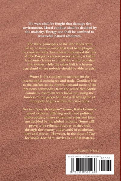 No wars shall be fought that damage the environment. Moral conduct shall be decided by the majority. Energy use shall be confined to renewable natural resources. The three principles of the One Book were meant to unite a world that had been plagued by constant wars, but instead unleashed the fury of The Purges, a society so restrictive, it failed. A calamity leaves over half the world crowded into domes while the other half is a barren wasteland where nobody should be able to exist. Water is the standard measurement for international commerce and trade. Conflicts rise to the surface as the domes demand more of the precious commodity from the water-rich Arctic countries. Skirmish wars break out along the borders of the green belt and a deadly game of monopoly begins within the city-states. In a post-dystopian future, some will prove to be reluctant heroes as they trek through the steamy underworld of cutthroats, liars and thieves. In the days of The Icelandic Accord to survive is all that matters.