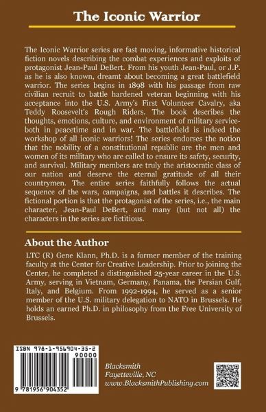 The Iconic Warrior series are fast moving, informative historical fiction novels describing the combat experiences and exploits of protagonist Jean-Paul DeBert. From his youth Jean-Paul, or J.P. as he is also known, dreamt about becoming a great battlefield warrior. The series begins in 1898 with his passage from raw civilian recruit to battle hardened veteran beginning with his acceptance into the U.S. Army's First Volunteer Cavalry, aka Teddy Roosevelt's Rough Riders. The primary objective of the series is to promote and enhance professionalism in the military and specifically, in the United States Army. A secondary objective is to inform with words and images those who have limited knowledge of the military and military history. The book describes the thoughts, emotions, culture, and environment of military service-both in peacetime and in war. The battlefield is indeed the workshop of all iconic warriors! The books are aimed at producing military professionals like George Washington, Matthew Ridgway, and Joshua Chamberlain and to avoid the likes of Attila the Hun, Tamerlane, Genghis Khan, or Vlad the Impaler. These books also endorse the notion that the nobility of a constitutional republic are the men and women of its military who are called to ensure its safety, security, and survival. When they take the oath to the U.S. Constitution, they are essentially saying that the supporting and defending the Constitution is more important than their life. Military members are truly the aristocratic class of our nation and deserve the eternal gratitude of all their countrymen. The historical events described in this series are from primary, original sources. The entire series faithfully follows the actual sequence of the wars, campaigns, and battles it describes. The fictional portion is that the protagonist of the series, i.e., the main character, Jean-Paul DeBert, and many (but not all) the characters in the series are fictitious. The books are not historically revised or rewritten based on the trends of the current culture. Consequently, they are not teleological presentism which looks at the past through the lens of current moral, social, or political judgments.
