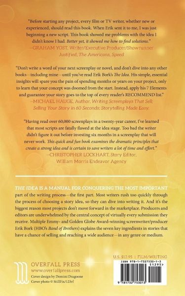 THE IDEA is a manual for conquering the most important part of the screenwriting or fiction writing process - the first part. Most writers rush too quickly through choosing a story idea, so they can dive into writing it. And it's the biggest reason most projects don't move forward in the marketplace: producers and editors are underwhelmed by the central concept. Multiple Emmy- and Golden Globe-winning screenwriter/producer Erik Bork (HBO's Band of Brothers) explains the seven key ingredients in stories that have a chance of selling and reaching a wide audience - in any genre or medium.