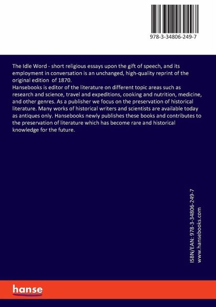 The Idle Word - short religious essays upon the gift of speech, and its employment in conversation is an unchanged, high-quality reprint of the original edition of 1870.Hansebooks is editor of the literature on different topic areas such as research and science, travel and expeditions, cooking and nutrition, medicine, and other genres. As a publisher we focus on the preservation of historical literature. Many works of historical writers and scientists are available today as antiques only. Hansebooks newly publishes these books and contributes to the preservation of literature which has become rare and historical knowledge for the future.
