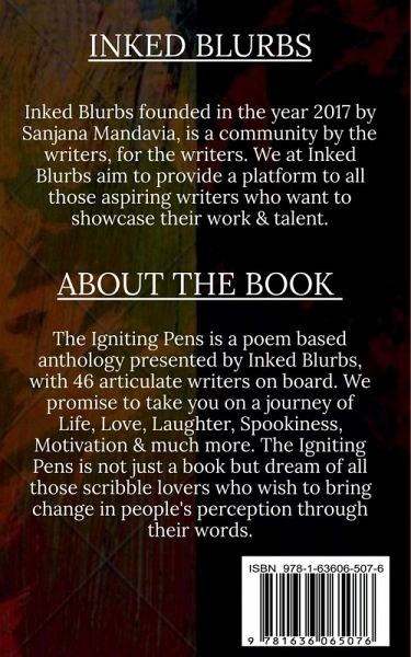 The Igniting Pens is a poem-based anthology presented by Inked Blurbs. With 46 articulate writers on board, we promise to take you on a journey of Love, Life, Laughter, Spookiness, Motivation & much more. The Igniting Pens is not just a book, but dream of all those scribblers who wish to bring change in people's perception through their words.