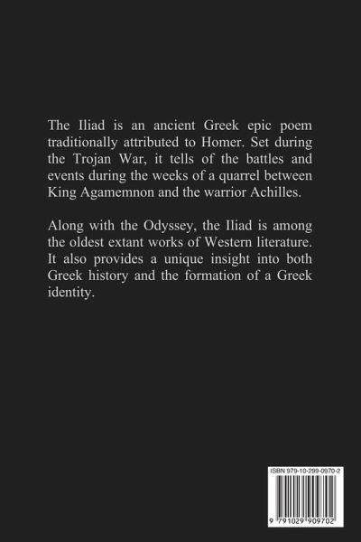 The Iliad is an ancient Greek epic poem traditionally attributed to Homer. Set during the Trojan War, it tells of the battles and events during the weeks of a quarrel between King Agamemnon and the warrior Achilles. Along with the Odyssey, the Iliad is among the oldest extant works of Western literature. It also provides a unique insight into both Greek history and the formation of a Greek identity.