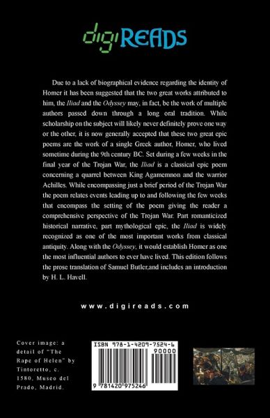 Due to a lack of biographical evidence regarding the identity of Homer it has been suggested that the two great works attributed to him, the "Iliad" and the "Odyssey" may, in fact, be the work of multiple authors passed down through a long oral tradition. While scholarship on the subject will likely never definitely prove one way or the other, it is now generally accepted that these two great epic poems are the work of a single Greek author, Homer, who lived sometime during the 9th century BC. Set during a few weeks in the final year of the Trojan War, "The Iliad" is a classical epic poem concerning a quarrel between King Agamemnon and the warrior Achilles. While encompassing just a brief period of the Trojan War the poem relates events leading up to and following the few weeks that encompass the setting of the poem giving the reader a comprehensive perspective of the Trojan War. Part romanticized historical narrative, part mythological epic, the "Iliad" is widely recognized as one of the most important works from classical antiquity. Along with the "Odyssey", it would establish Homer as one the most influential authors to ever have lived. This edition is printed on premium acid-free paper, follows the prose translation of Samuel Butler, and includes an introduction by H. L. Havell.