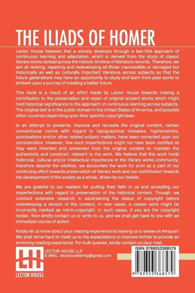 Homer (750 bc - unknown) Popularly known as Homer, Melesigenes authored two of the oldest extant epics of Greek mythology: the Iliad and Odyssey. Said to have been blind, he narrated both his books as poetry, and they were first written down in the format of a script in the 8th century bce. Melesigenes's travels across the country of Greece as a poet brought him to the Hermaean plain in the county of Cumae where he adopted the name, Homer - a name that was given by the people of the county to blind men. His promises of bringing the county reclaim if they supported him were met with resistance, and this drove the poet to Phocoea, and then to Erythrae. Thereafter, he arrived in the town of Chios, where he married and started a family. Originally written in Homeric Greek, both the Iliad and Odyssey have been translated into multiple languages across the world. His descriptions of love, loss, friendship, anger, angst, war, brotherhood, and kinghood transcend time and age, and continue to pull a reader towards his works. This edition of the Illiad was translated by Alexander Pope (1688-1744), a poet whose satirical poetry won him widespread acclaim. His translations of the Iliad and Odyssey are considered some of his best works till date.