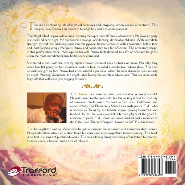 This is an enchanting tale of mythical creatures and intriguing, action-packed adventures. This magical story features an innocent teenage boy and a majestic princess. The Illegal Child begins with an unsuspecting teenager named Danny who leaves a Halloween party one dark and eerie night. He encounters a strange, odd-looking, despicable old man. With incredible strength, the old man suddenly turns into this gigantic, hideous creature with a contorted, hellish face and loud flapping wings. He grabs Danny and carries him to a far-off castle. The adventures begin in this godforsaken place. Held against his will, Danny feels doomed to a life of hell until he gazes upon the most incredible beauty he has ever witnessed. She stared at him with the dreamy, lightest brown caramel eyes he had ever seen. Her silky long wavy hair fell gently on her shoulders, and her face revealed a mocha-like radiant glow. This was no ordinary girl! In fact, Danny had encountered a princess, whom he later discovers was actually an angel. Meeting Valentonia, the angel, takes Danny on countless adventures. This is a remarkable fairy tale that will leave you begging for more.