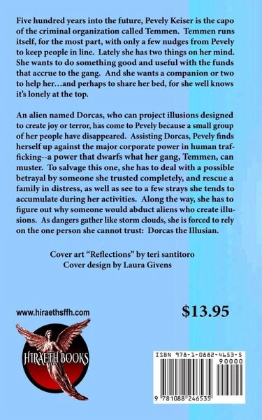 Five hundred years into the future, Pevely Keiser is the capo of the criminal organization called Temmen. Temmen runs itself, for the most part, with only a few nudges from Pevely to keep people in line. Lately she has two things on her mind. She wants to do something good and useful with the funds that accrue to the gang. And she has a companion or two to help her...and to share her bed, for she well knows it's lonely at the top. An alien named Dorcas, who can project illusions designed to create joy or terror, has come to Pevely because a small group of her people have disappeared. Assisting Dorcas, Pevely finds herself up against the major corporate power in human trafficking--a power that dwarfs what her gang, Temmen, can muster. To salvage this one, she has to deal with a possible betrayal by someone she trusted completely, and rescue a family in distress, as well as see to a few strays she tends to accumulate during her activities. Along the way, she has to figure out why someone would abduct aliens who create illusions. As dangers gather like storm clouds, she is forced to rely on the one person she cannot trust: Dorcas the Illusian.