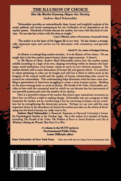 The market economy attends well to some dimensions of human life and does not even see others. It is sensitive to those values pertaining to what can be bought and sold but is blind to others that cannot be turned into commodities, such as the integrity of the natural world and the quality of human relationships. The market registers the costs and benefits to transactors acting as social atoms but is impervious to the costs of tearing apart the larger wholes-families, communities, the biosphere-that are vital to the quality of our lives. In The Illusion of Choice, Andrew Bard Schmookler shows how the market system unfolds according to a logic of its own, shaping everything within its domain-the landscape, social institutions, even human values-to serve its own inherent purposes. This understanding helps illuminate what has been most troubling to generations of Americans struggling to create a more humane society, and provides the conceptual tools by which we can become less the instruments of our powerful systems and more the masters of our destiny. Here is a powerful critique of the market, not couched in the Marxist economics of surplus value and exploitation, but drawing upon mainstream economics to shows how we all have a stake in making change. Schmookler sets out a program to help us humanize the market, not by overthrowing it but be correcting its biases, not by revolution but by strengthening the democratic process. Perhaps we can now add the most important choice to the abundance of choices the market provides us: the choice of developing into the kind of society we really want to be.