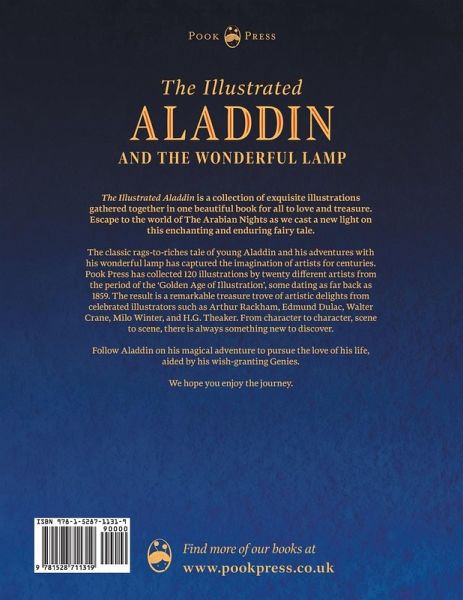 The Illustrated Aladdin' is a collection of exquisite illustrations gathered together in one beautiful book for all to love and treasure. Escape to the world of The Arabian Nights as we cast a new light on this enchanting and enduring fairy tale. The classic rags-to-riches tale of young Aladdin and his adventures with his wonderful lamp has captured the imagination of artists for centuries. Pook Press has collected 120 illustrations by twenty different artists from the period of the 'Golden Age of Illustration', some dating as far back as 1859. The result is a remarkable treasure trove of artistic delights from celebrated illustrators such as Arthur Rackham, Edmund Dulac, Walter Crane, Milo Winter, and H.G. Theaker. From character to character, scene to scene, there is always something new to discover. Follow Aladdin on his magical adventure to pursue the love of his life, aided by his wish-granting Genies. We hope you enjoy the journey.